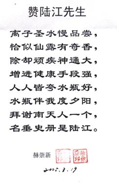 凡尊重中國古代養(yǎng)生智慧的患者,堅持“已饑方食”和定時主動補水者,均可祛病康復(fù)。如牡丹江醫(yī)學(xué)院87歲的張鵬圖飲用半年后高血壓未痊愈,陸江與他通話交流,了解他原先每日主食4兩,建議他用“已饑方食”減少主食肉食量,他理解后,將每日主食減為3兩,少吃兩塊肉,飲用一年治愈26年的冠心病和高血壓。他2003年5月31日來信說:“飲用卓康小分子團水是根治高血壓、冠心病、糖尿病的一把金鑰匙,是填補醫(yī)學(xué)空白,為人類造福,應(yīng)推廣該產(chǎn)品。”