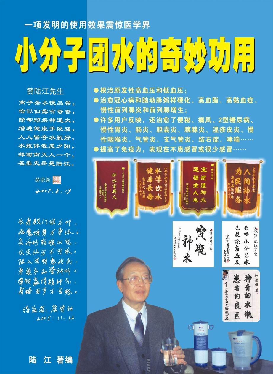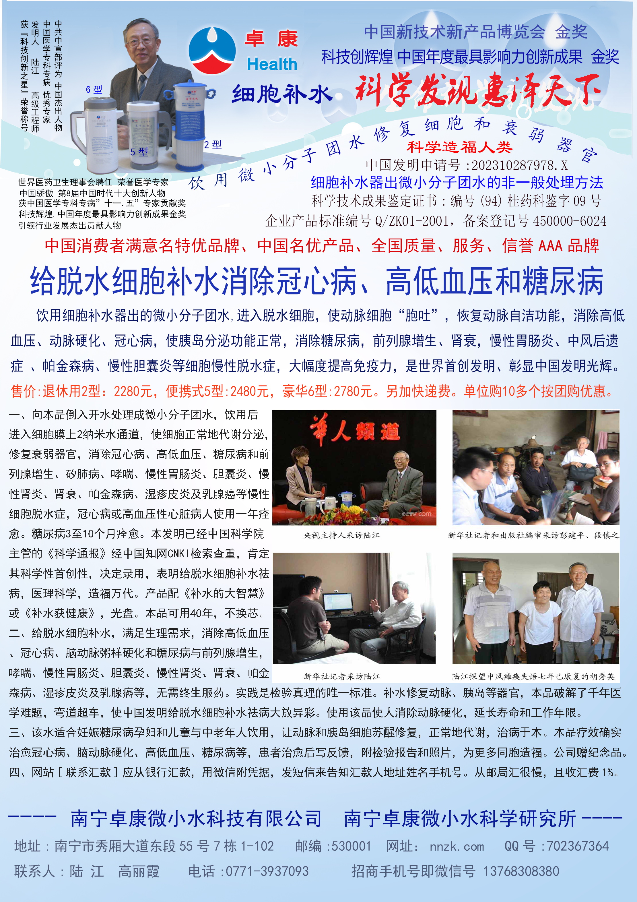 人類幾千年來患以上病癥需終生服藥,幾十年也不能治愈。可是我國南寧的高級工程師陸 江,于1990年想根治高血壓,研究發(fā)明了離子水瓶,處理出微小分子團水供飲用,經(jīng)過醫(yī)院臨床試用和專家鑒定,1999年獲中國發(fā)明專利權(quán),產(chǎn)品于2000年投放市場后一直跟蹤調(diào)查,據(jù)全國各地用戶反饋:祛除了高低血壓、糖尿病和冠心病,并使前列腺增生、咽喉炎、鼻竇炎、慢性氣管炎、支氣管炎、矽肺病、哮喘、慢性胃炎、腸炎、慢性膽囊炎、慢性腎炎、腎衰、膀胱炎、便秘、痔瘡、風(fēng)濕性關(guān)節(jié)炎和濕疹皮炎及中風(fēng)后遺癥等病癥不藥而愈。為什么喝微小水能治20多種病?陸 江從1991年德國科學(xué)家發(fā)現(xiàn)細胞膜水通道僅為2納米獲得啟發(fā),認為多種器官患病是因細胞脫水,不能正常代謝和分裂增殖,才使器官細胞減少致衰弱萎縮而形成細胞缺水性病癥。22年來的實踐有力地支持了“細胞脫水致病”這一重要論點,表明喝微小水可滿足細胞的生理需求,補水就能祛病,是生命科學(xué)新亮點。